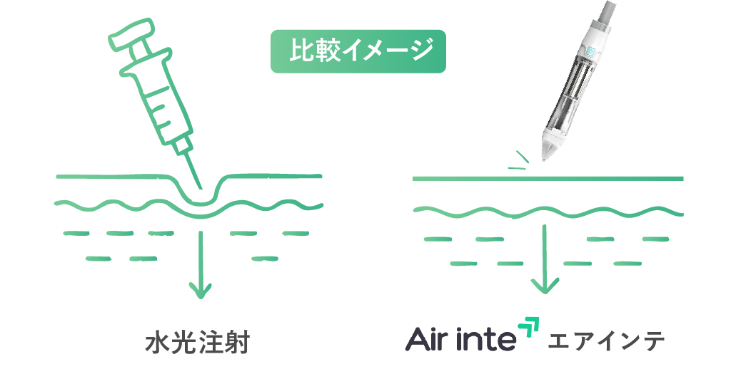 エアインテは、特許取得の浸透技術により角質層まで深く届き、肌に優しく効果的に美容成分を届けます。従来の水光注射と比較して、安全性と快適さが向上し、さまざまな肌質に対応可能です。