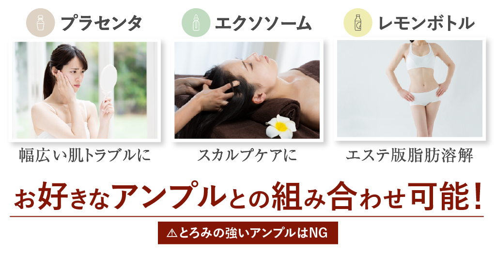 肌ケア、スカルプケア、脂肪溶解など、求める効果は無限大。プラセンタ、エクソソームなど、肌に合わせたオプションが可能です。