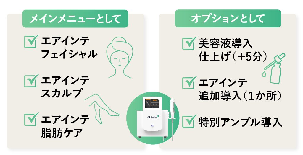 メインメニューにもオプションメニューにも対応可能。エアインテ単体でのメニュー提案や、美容液導入のオプション提案もできます。