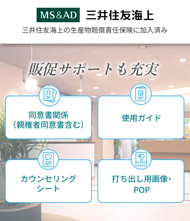 美容機器の制作実績が20年以上の工場で制作しており、保険会社にも安全性を立証しております。