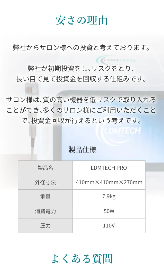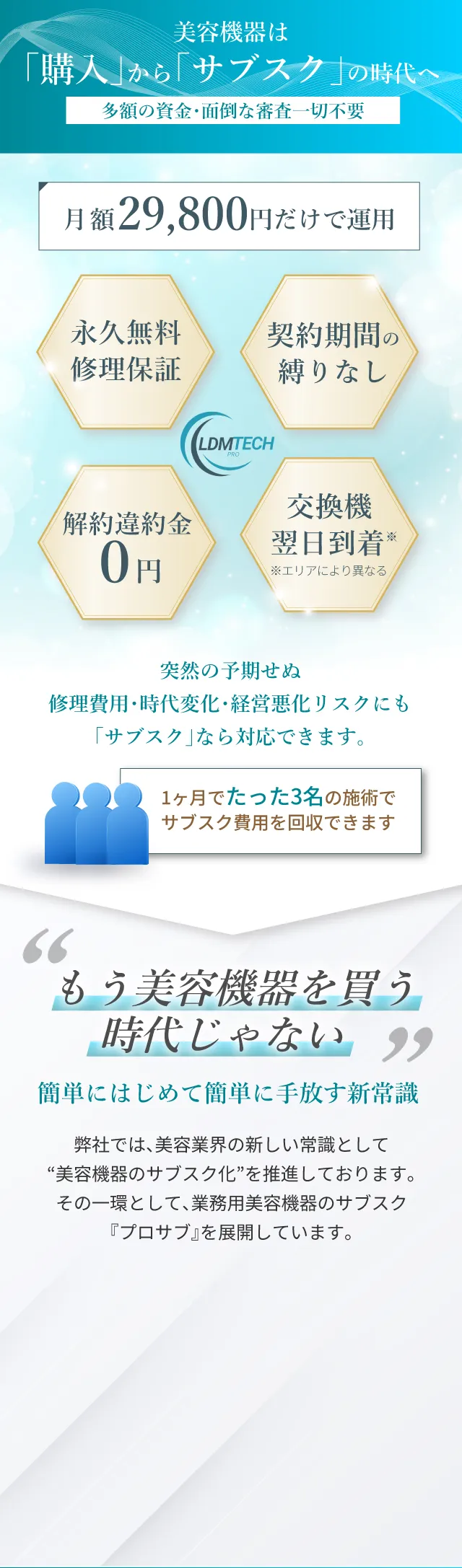 サロン様の規模や目的によっても異なりますが、弊社のサブスクであれば、永久無料保証を完備しておりますので、常に万全の状態で活動でき、